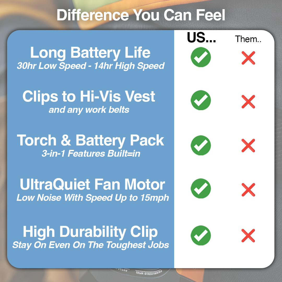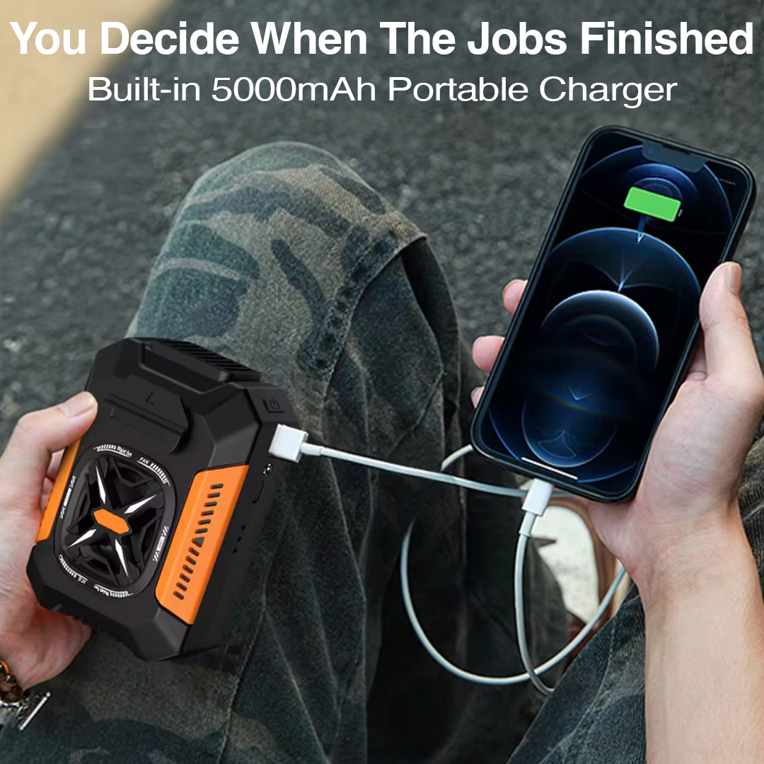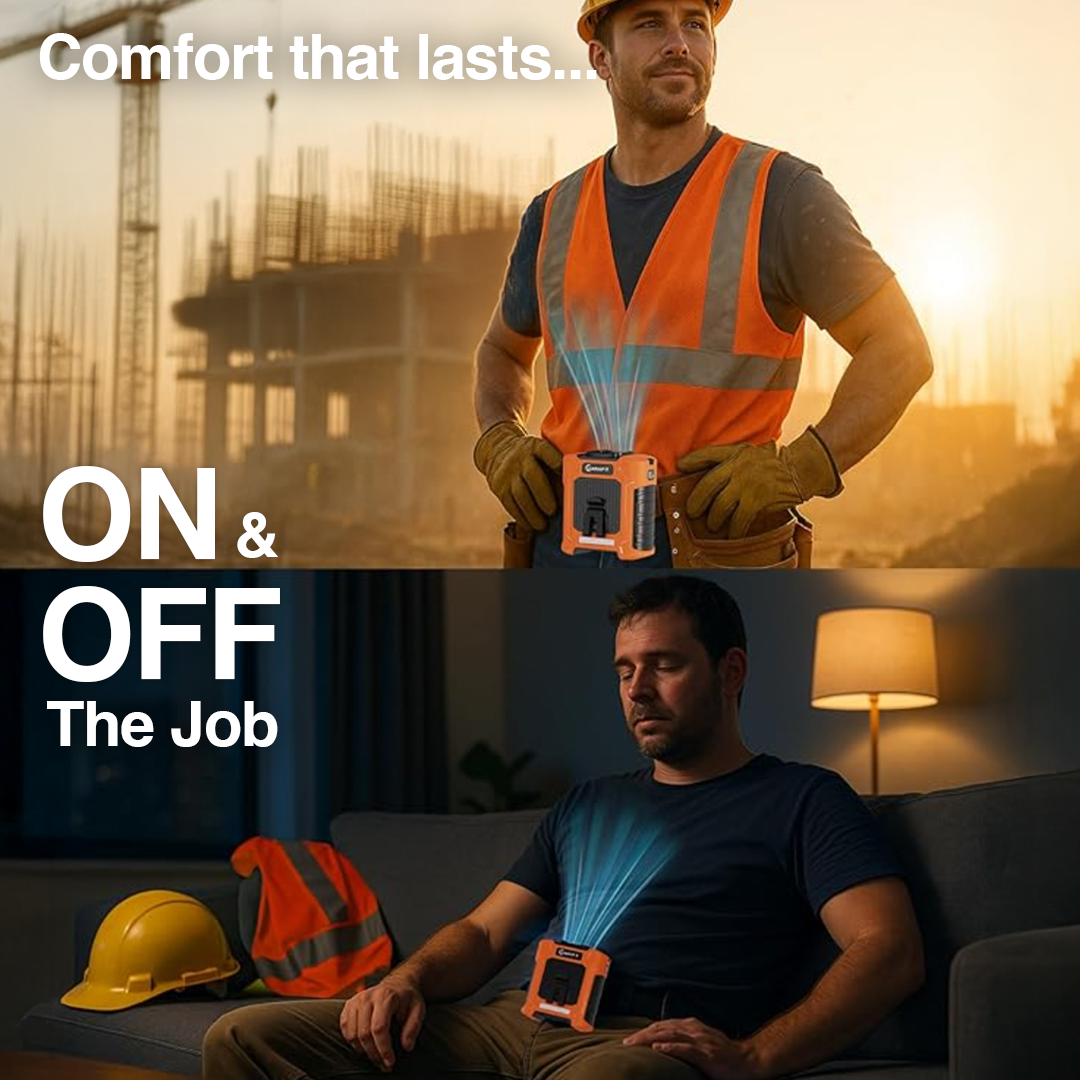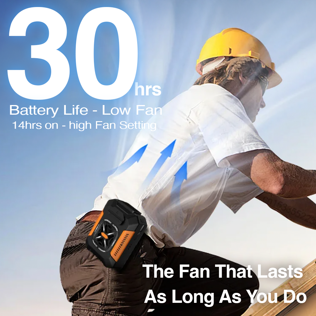 This fan is a lifesaver on roofing jobs. It clips right to my belt and keeps air flowing when the sun's beating down. Plus I can charge my phone on the go without stopping. Bought one for my whole crew.